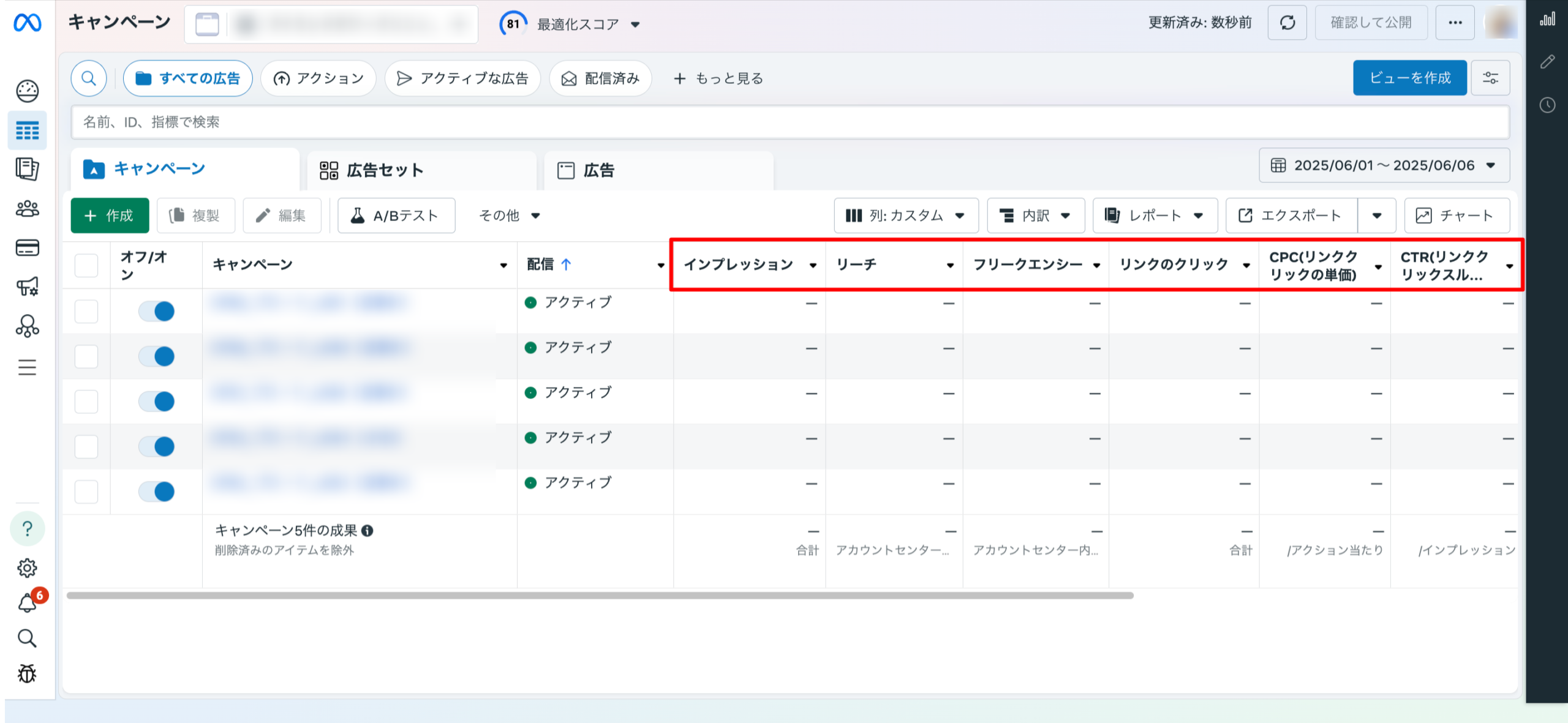 Meta広告でチェックすべき指標は、配信目的や検証内容によって異なりますが、一般的には、インプレッション数、リーチ数、クリック数、クリック率 (CTR)、クリック単価 (CPC)、コンバージョン数、コンバージョン率 (CVR)、コンバージョン単価 (CPA)、フリークエンシーなどの指標が挙げられます。