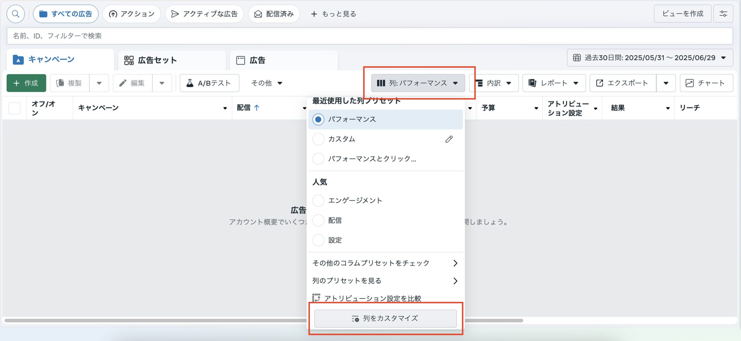 Meta広告の管理画面に見たい指標が表示されていない場合は、「列:パフォーマンス」から「列をカスタマイズ」に進むことで、項目を追加したり、減らしたりすることができます。並び替えも可能なので、見やすいように設定することが大切です。